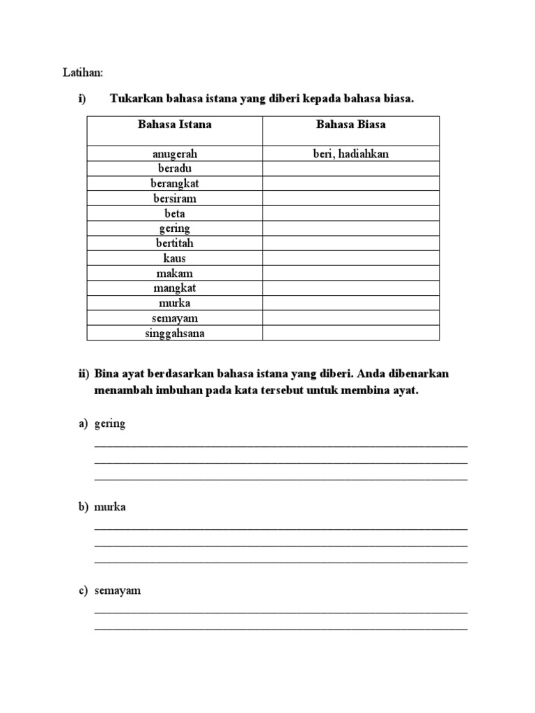 Bahasa istana atau bahasa dalam ialah suatu laras bahasa halus yang digunakan dalam kalangan kerabat diraja sama ada dengan tujuan berhubung atau berbicara dengan golongan tersebut mahupun semasa menyebut atau memberitakan hal ehwal berkenaan raja dalam sesetengah bahasa baik masih digunakan hari ini mahupun tinggal sejarah. Tahniah atas kerja baru anda. Contoh Ayat bagi Perkataan Hampir Sama Bunyi.